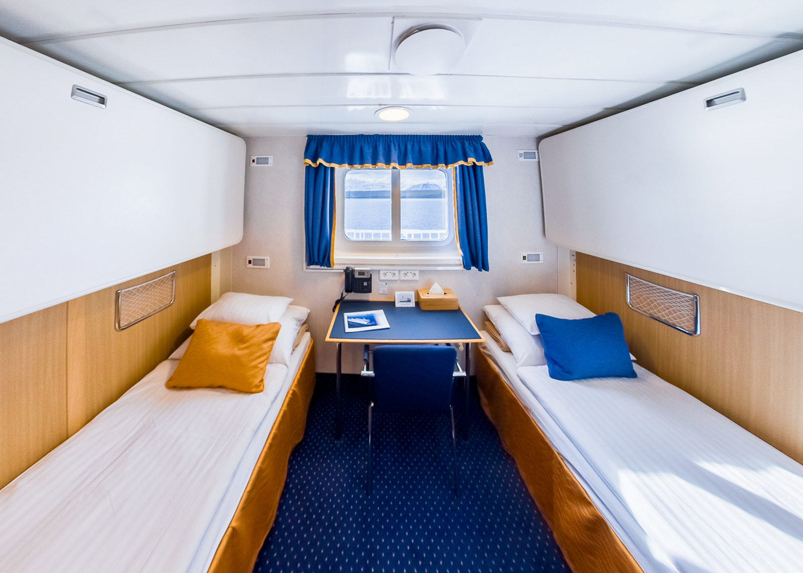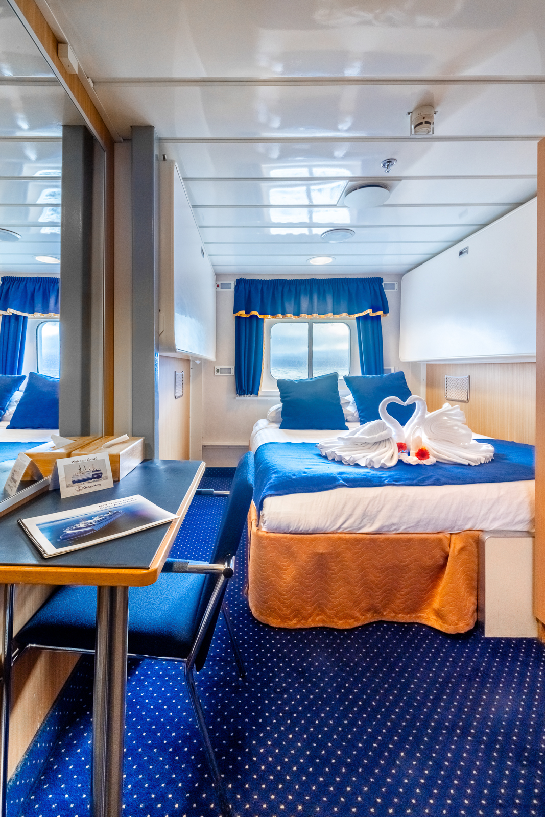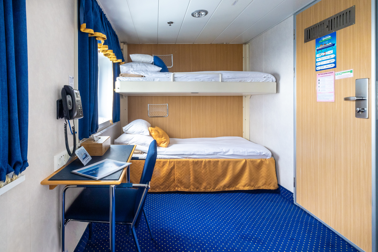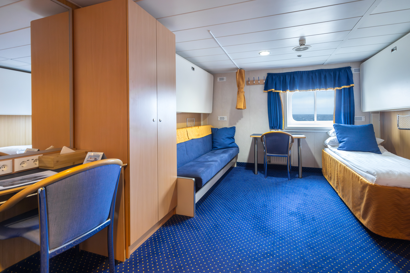 Upper Deck – Window, Two lower and one upper berth, bathroom with a shower, hair dryer, bathrobe, towels, body wash, and hair care products, desk with a chair, heater under desk, air ventilation, electrical outlets: 220V/50Hz (European), cupboard, two wardrobes, ~ 159 square feet.
