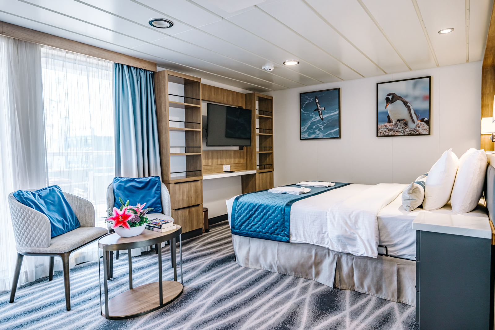 Panoramic decks, bright lecture lounges, a cozy library, and excellent outdoor spaces provide natural gathering places—perfect for sharing discoveries, swapping stories, or reflection. Guests also enjoy hands-on workshops that spark creativity and learning. Accommodation includes ninety-three ocean-view cabins, most with private balconies, plus single-occupancy options for independent travellers. Wi-Fi (basic service included) ensures guests stay connected while immersed in the adventure.