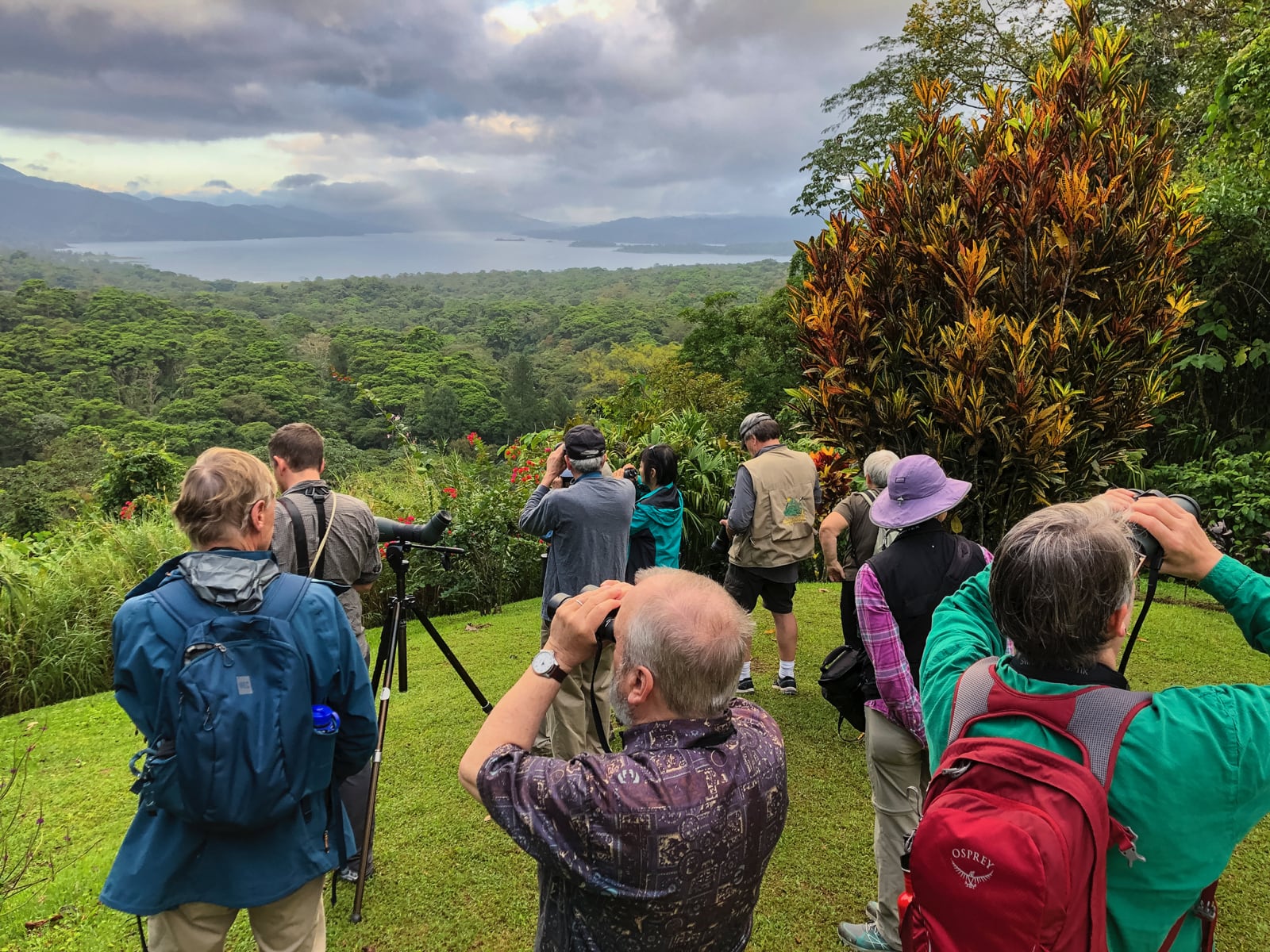 After lunch, we stroll along a quiet mountain road (for traffic, not birds!) with views of the gorgeous Lake Arenal. This tactic allows plenty of viewing space for our group, and walking here is a pleasant way to spend an afternoon. One of our targets is Keel-billed Motmot, a canopy-dwelling beauty with a limited range and interesting call. Some of the more common species we might encounter are Bare-crowned Antbird, Bright-rumped Attila, Mistletoe and Yellow Tyrannulets, and Crimson-collared Tanager. Elusive targets include: Yellow-eared Toucanet, Rufous-winged Tanager, Great Potoo, Ornate Hawk-Eagle and Semiplumbeous Hawk.