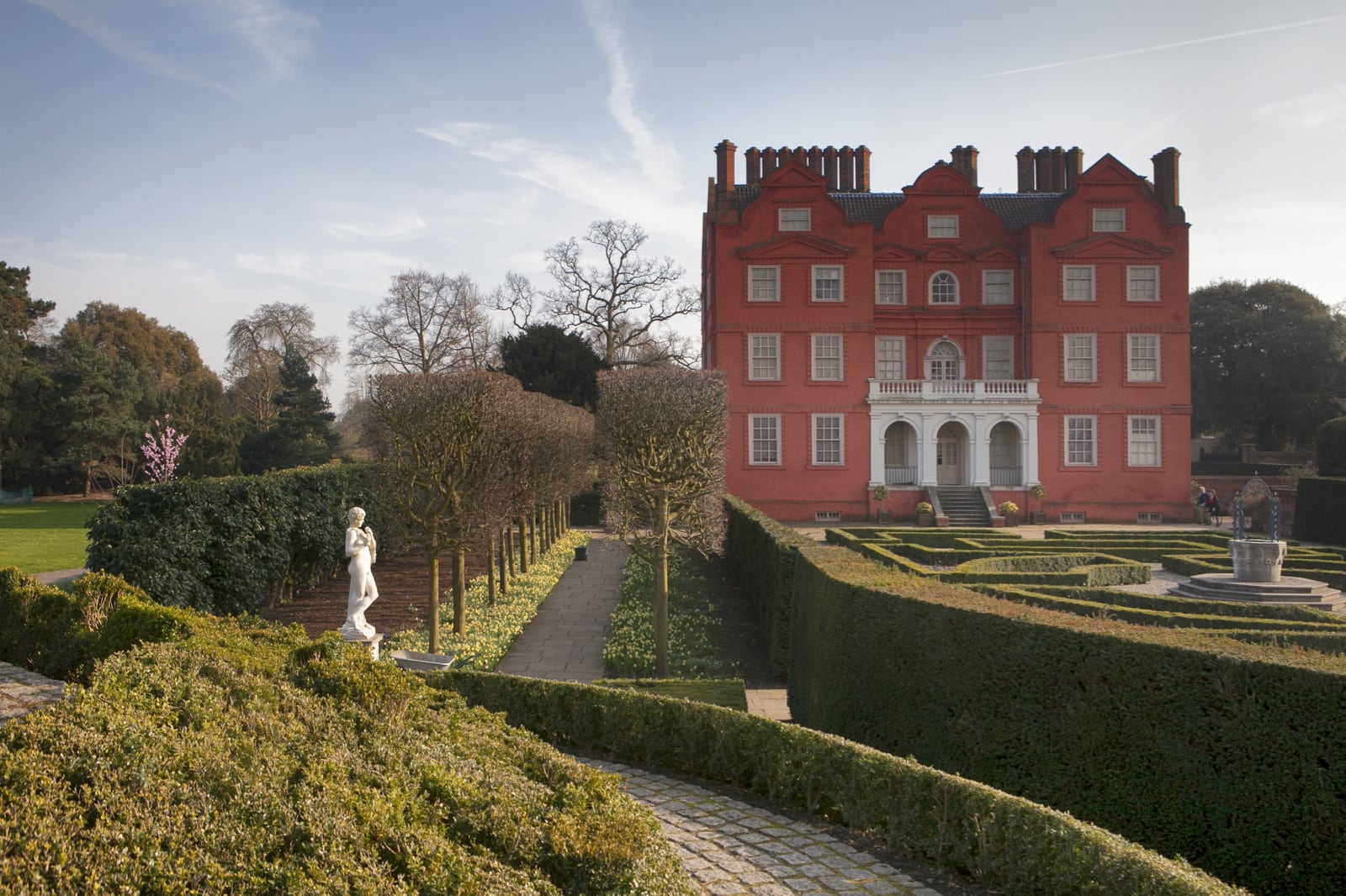 Wyken Hall Gardens is a romantic 4-acre garden, designed with a series of `rooms´ wrapped around a cosy pink house. The knot and herb gardens were designed by Arabella Lennox-Boyd. There is a kitchen garden, an old fashion rose garden enclosed by a hornbeam hedge and rose pergola, herbaceous borders, a wild garden, wildflower meadow, birch corpse, gazebo and beech maze. Whimsical touches include a porch with rocking-chairs and sculptural wildlife dotted around the house and garden. Overnight near Thetford, Norfolk.