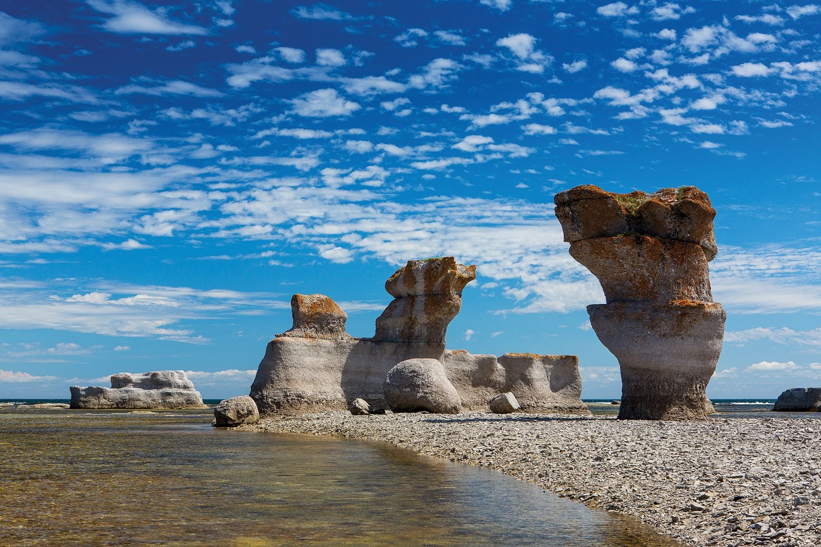 Sail into a dreamscape of stone and sea. Along this Gulf coast, wind and water have sculpted limestone into monoliths—towering figures that rise from the Gulf like natural cathedrals. This is Canada’s largest concentration of erosion-carved limestone monoliths—but it’s also a place where geology, ecology, and imagination meet.