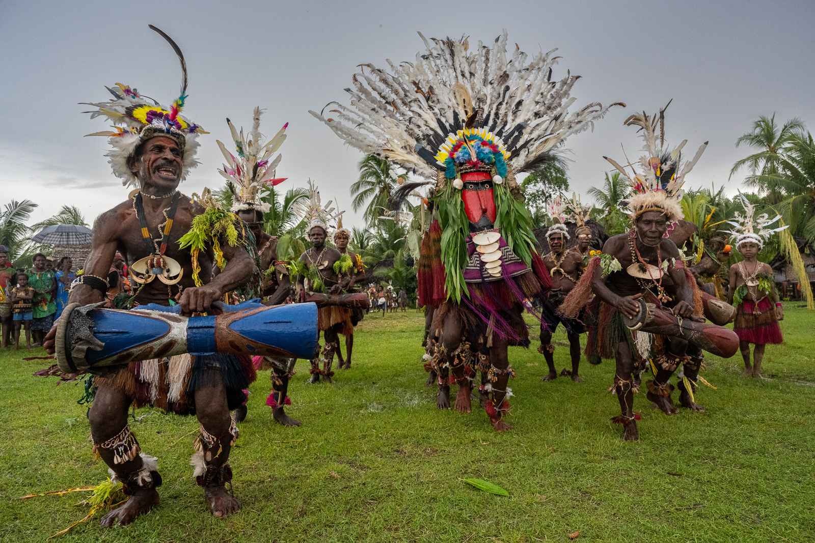 Ten thousand square miles of mangrove forest, bamboo, and sago palms have long sheltered the Asmat region from outsiders. At high tide, our ship enters the shallow channel of the Flamingo River to anchor near the village of Agats, the regional capital of the Asmat. A remote riverine world is revealed as Zodiacs carry you along narrow waterways lined with the entwined branches of thick mangrove forests, home to Torresian Imperial Pigeons, Sulphur-crested Cockatoos, and bright red lorikeets. As you make your way upstream, villagers – whooping and chanting in elaborate warrior gear and paint – paddle vigorously toward you in intricately carved canoes to escort you ashore where an enthusiastic welcome awaits. A walk along elevated wooden boardwalks leads to a cathedral with superb carvings, and museum with displays of ancestor poles, drums, body masks, shields, daggers, and skulls; a reminder that cannibalism and head-hunting was practiced by the ancestors of some villagers. Asmat woodcarvings are known for their powerful lines and coarse, expressive motifs, and are widely considered by collectors and scholars to be among the world’s finest carvings and can be purchased directly from the village artisans.