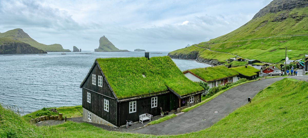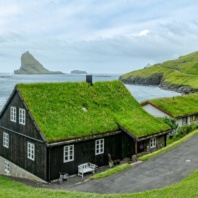 Admire the buildings with their grass roofs and black timber façades, offering a glimpse into traditional Faroese architecture and culture.