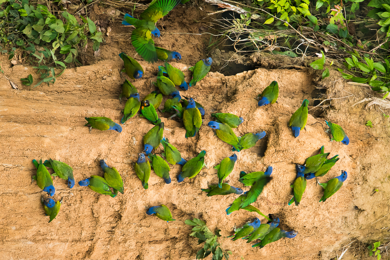 We begin early with one of the true highlights of the Amazon: a morning visit to an immense macaw clay lick where four large macaw species — the Red-and-Green Macaw, Scarlet Macaw, Blue-and-Yellow Macaw, and Chestnut-fronted Macaw — gather alongside parakeets, amazons and other parrots in a frenetic spectacle of colour and sound. Clay licks are vital natural features in the rainforest: birds and parrots consume the exposed mineral-rich earth for nutrients such as sodium and other trace elements, helping neutralize toxins from their fruit-based diets and maintain physiological balance.